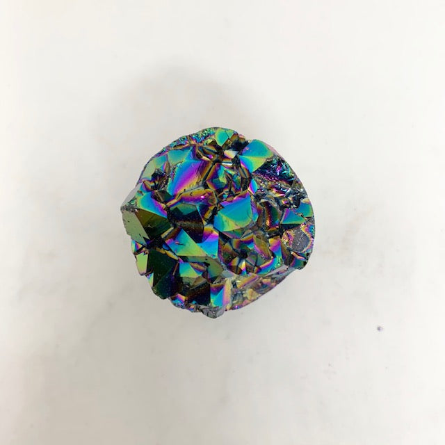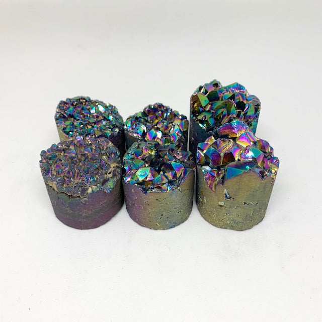 These gorgeous multi-colored aura quartz crystal cylinders are truly magical in appearance. These crystals possess manifestation properties; their energies can be used to bring your dreams and desires to fruition. Each cylinder is completely unique. They make for a thoughtful healing gift for friends or family.